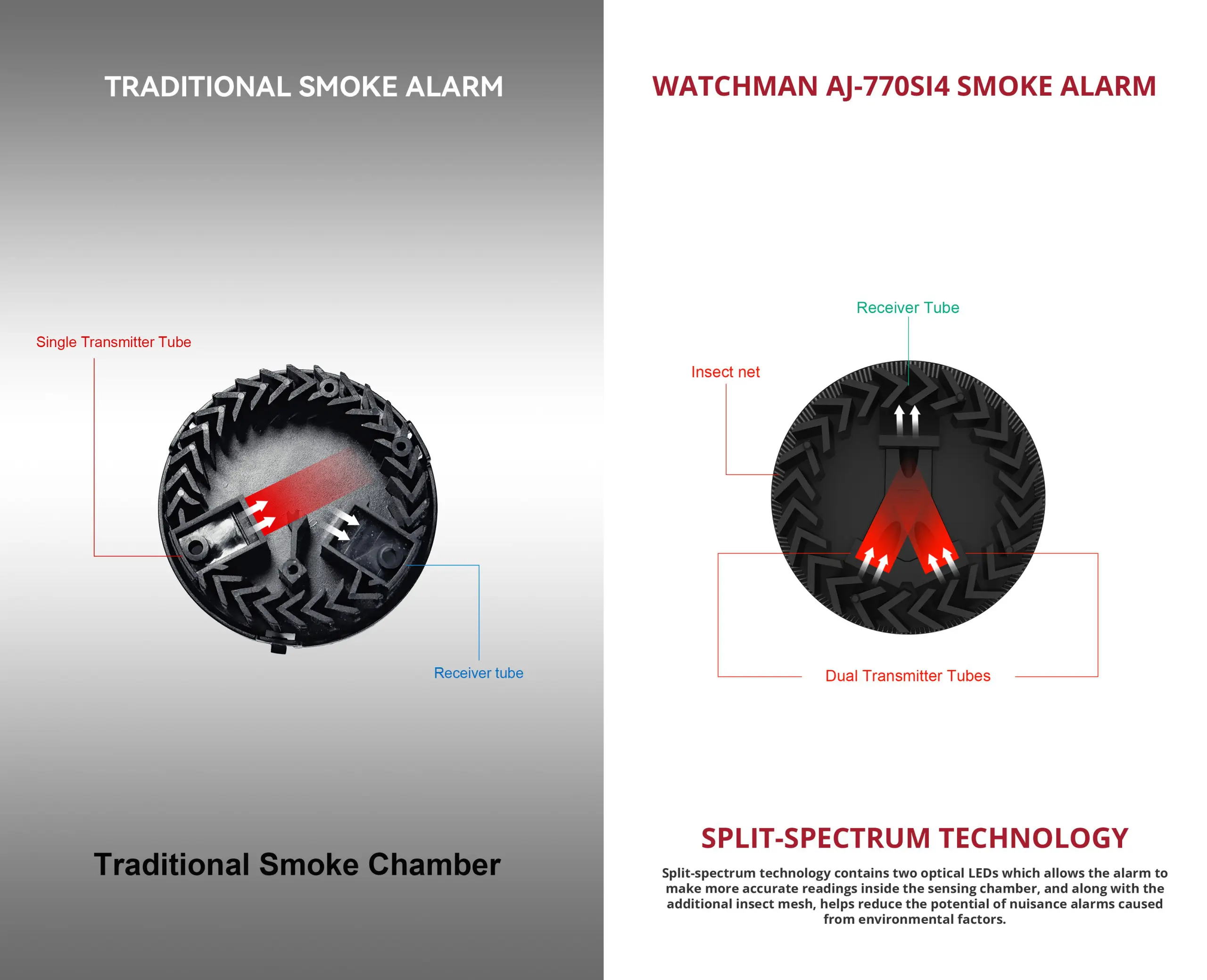The alarm contains cutting-edge, split-spectrum technology. Split-spectrum allows the alarm to make more accurate readings inside the sensing chamber by using two optical lights and wavelengths, and along with the additional insect mesh, helps reduce the potential of nuisance alarms caused from environmental factors.